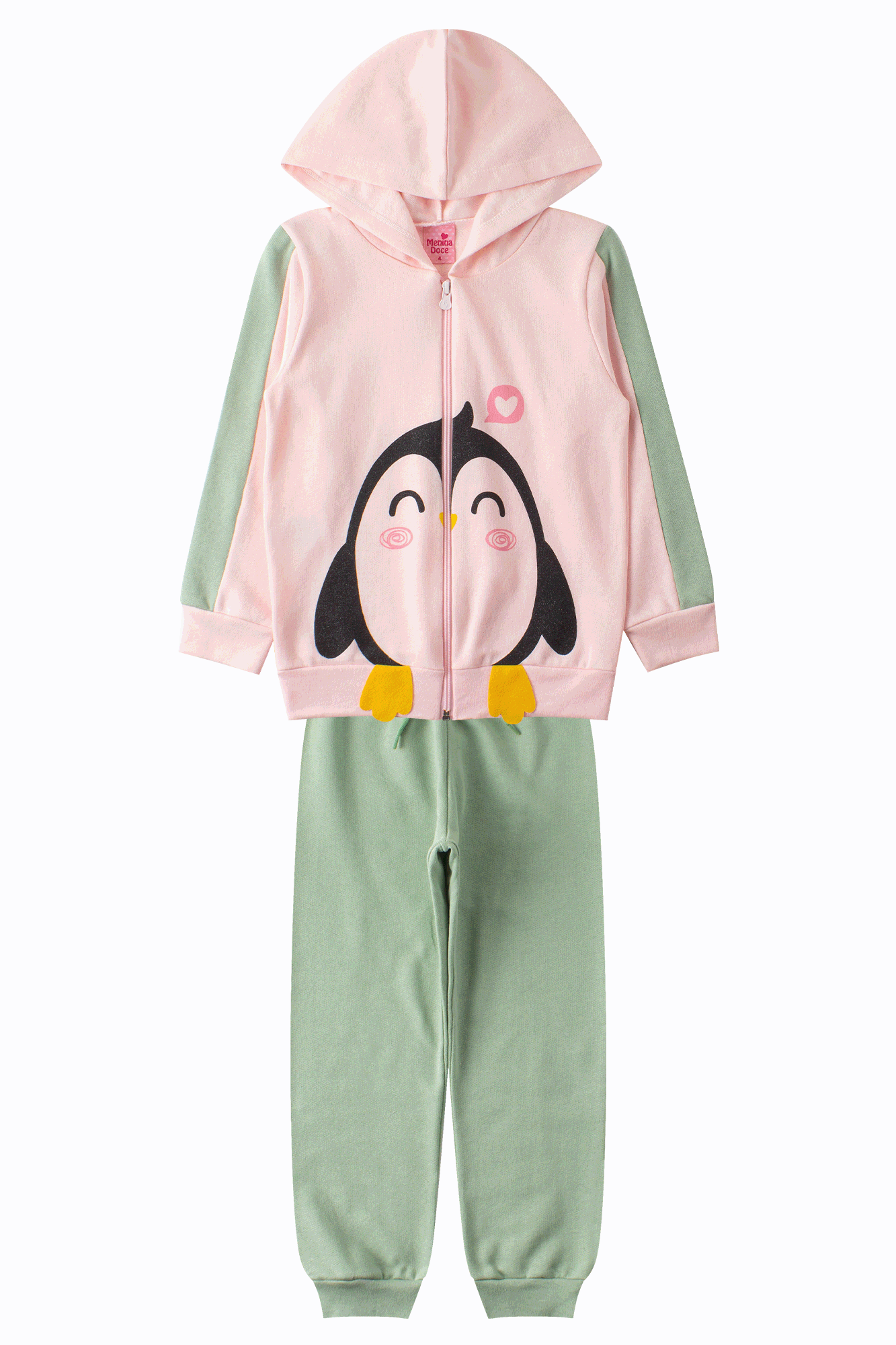 Ref. MD60012-RosaBebeConjunto Infantil Feminino Pinguim Rosa Claro composto por duas peças. Jaqueta confeccionado em moletom peluciado (100% algodão), gola redonda com capuz, abertura frontal com fecho em zíper, estampa frontal com detalhe de glitter e aplique frontal de patinhas em feltro, mangas com recorte e aplique de cor contrastante (100% algodão), punhos. Calça confeccionado em moletom peluciado (100% algodão), cós com elástico e aplique frontal de cordão decorativo, punhos.