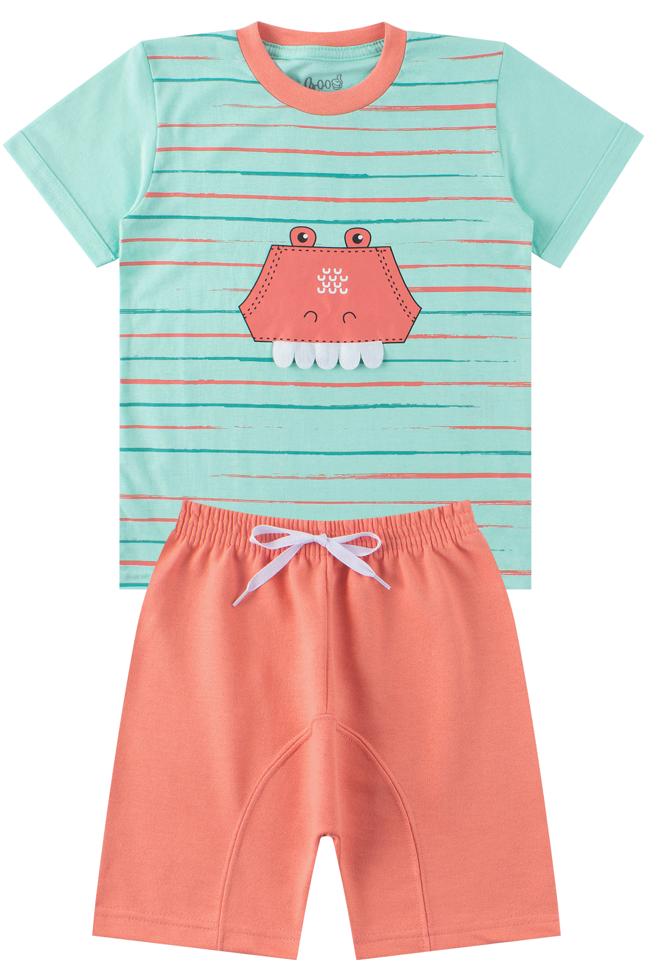 Ref. GB2202-VerdeAguaConjunto Infantil Masculino Meia Malha/Moletinho Divertido Verde Água composto por duas peças. Camiseta confeccionado em meia malha (100% algodão), gola redonda com aplique de cor contrastante, estampa frontal com aplique interativo de dentinhos em feltro. Bermuda Saruel confeccionado em moletinho (75% algodão 25% poliéster), cós com elástico e aplique frontal de cordão decorativo.