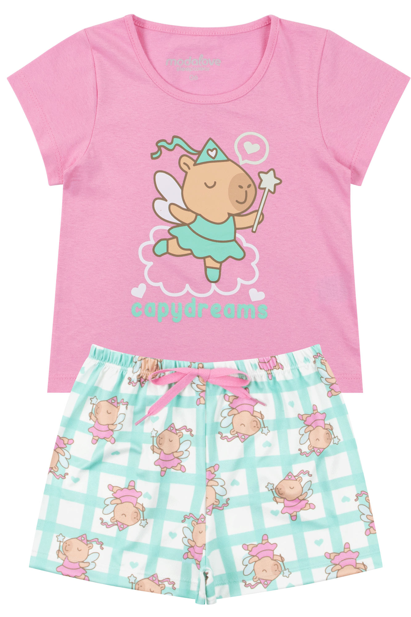 Ref. PIG10111-RosaChicletePijama Infantil Feminino Meia Malha/Suplex Sublimado Capy Dreams Rosa Chiclete composto por duas peças. Blusa confeccionada em meia malha (100% algodão), gola redonda, estampa frontal brilha no escuro. Shorts confeccionado em suplex sublimado (96% poliéster 4% elastano), cós com elástico e aplique frontal de cordão decorativo.